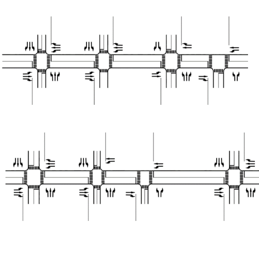上下游交叉口的间距不太长(一般不超过 1000 米)且至少有两条以上直行车道