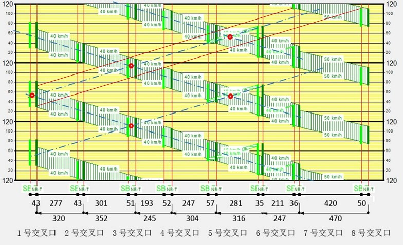 4、设计主要协调方向绿波方案,选择交通量大的一侧为主要协调方向,根据实际交通运行当中的车队车流平均车速进行绿波的设计(绿波行进速度一般取限速的 0.85-1.0 倍)。绿波行进速度的确定非常重要,须通过反复观察实际交通流的运行情况,且须观察分析红灯期间聚集在停止线前车辆的绿灯需求,并将其一并考虑在内,来确定合适的设计波速,再结合图交叉口间距数据,就可以形成主要协调方向以绿初为参考点的绿波方案。
