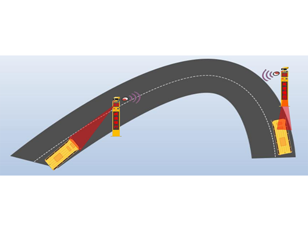 2、弯道路段在两端各安装一台会车预警一体机,当双向会车时通过远距离雷 达发现来车的速度和方向,采用无线组网方式立即通过声光电技术 (LED屏幕、 高音喇叭、爆闪灯) 警示对向车辆达到预警、预防的安全通行效果,有效避免交 通事故。